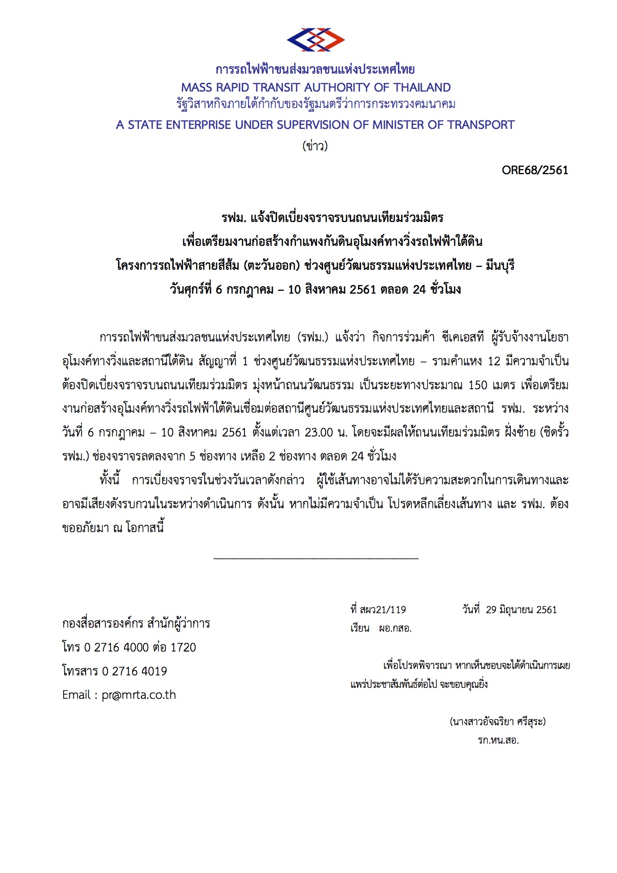 รฟม. แจ้ง ปิดเบี่ยงจราจรบนถนนเทียมร่วมมิตร ฝั่งขาเข้า มุ่งหน้า ถนน วัฒนธรรม 3 ช่องทาง ระยะประมาณ 150 เมตร เพื่อดำเนินการก่อสร้างกำแพงกันดิน (D-Wall) สำหรับงานก่อสร้างอุโมงค์ใต้ดิน รถไฟฟ้าสายสีส้ม โดย กิจการร่วมค้า ซีเคเอสที ระหว่างวันที่ 6 กรกฎาคม - 10 สิงหาคม 2561 ตั้งแต่เวลา 23.00 น. ปิดเบี่ยงตลอด 24 ชั่วโมง ส่งผลให้ถนนเทียมร่วมมิตร บริเวณดังกล่าว ช่องจราจรลดลงจาก 5 ช่อง เหลือเพียง 2 ช่องทาง