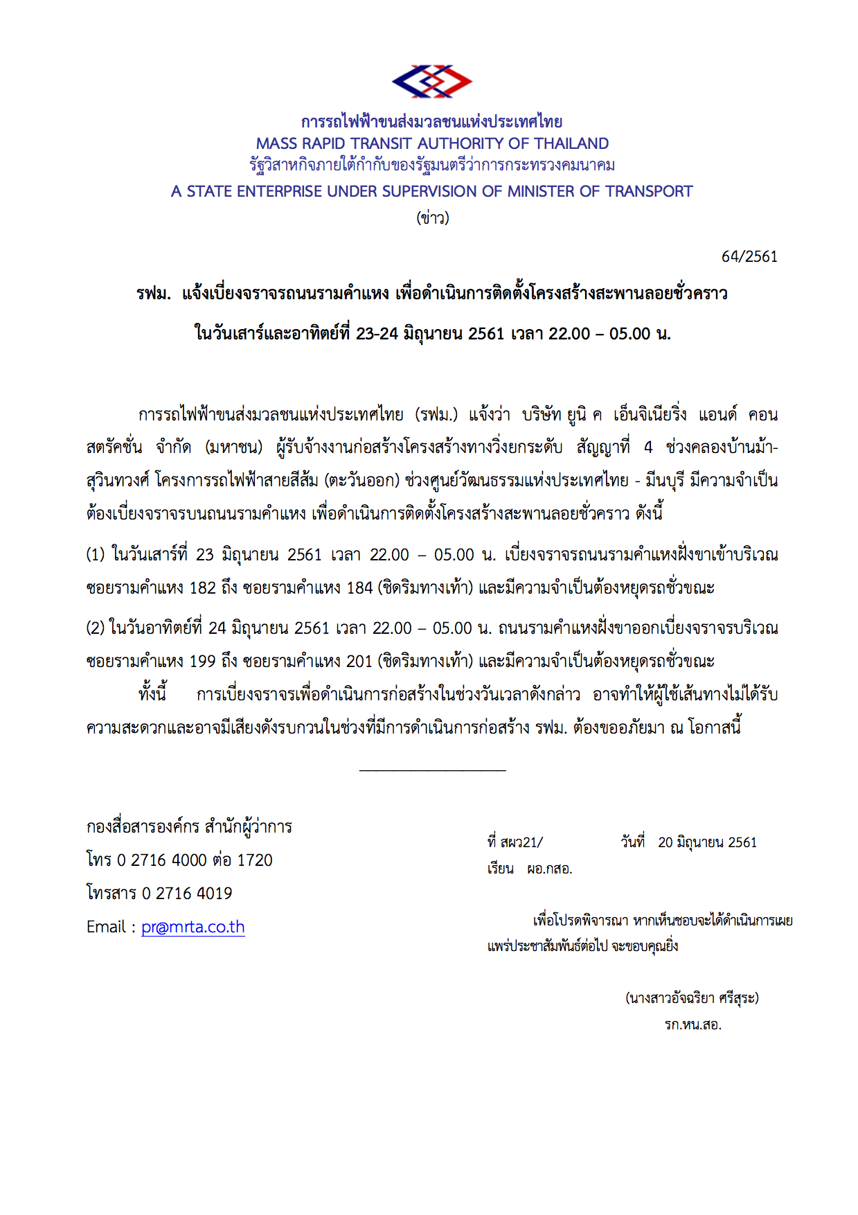 รฟม. แจ้งเบี่ยงจราจรถนนรามคำแหง เพื่อดำเนินการติดตั้งโครงสร้างสะพานลอยชั่วคราว ในวันเสาร์และอาทิตย์ที่ 23-24 มิถุนายน 2561 เวลา 22.00 – 05.00 น.